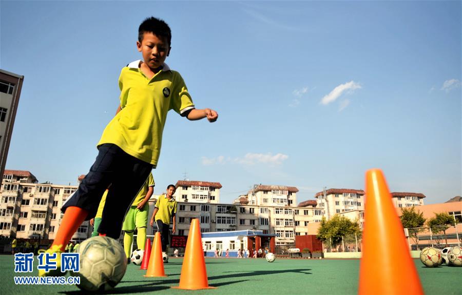 9月5日,在承德市雙橋區東園林小學,學生在練習帶球。2018年以來,河北省承德市雙橋區推出“三點半”課堂,依托校園特色社團并引入校外培訓機構為學生提供課后延時服務。學生可自愿在每天下午放學后參加舞蹈、足球、機器人等豐富多彩的社團活動。新華社記者 王曉 攝