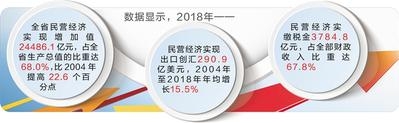 一系列舉措激發了民營經濟活力,我省民營經濟迅速發展。數據顯示,2018年,全省民營經濟實現增加值24486.1億元,占全省生產總值的比重達68.0%,比2004年提高22.6個百分點。2018年,民營經濟實現出口創匯290.9億美元,2004年至2018年年均增長15.5%。2018年民營經濟實繳稅金3784.8億元,占全部財政收入比重達67.8%。