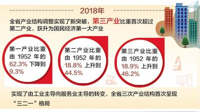 “黨的十八大以來,全省大力推進產業結構調整,著力化解過剩產能,加快推進服務業發展。”省統計局相關負責人介紹,2018年,全省產業結構調整實現了新突破,第三產業比重首次超過第二產業,躍升為國民經濟第一大產業。2018年,第一產業比重由1952年的62.3%下降到9.3%,第二產業比重由1952年的18.8%上升到44.5%,第三產業比重由1952年的18.9%上升到46.2%,實現了由工業主導向服務業主導的轉變,全省三次產業結構首次呈現“三二一”格局。