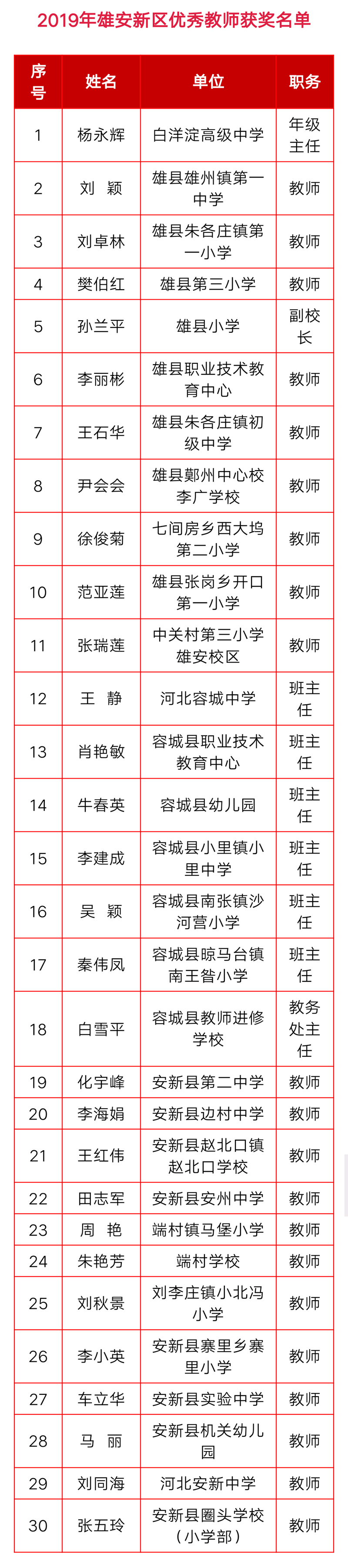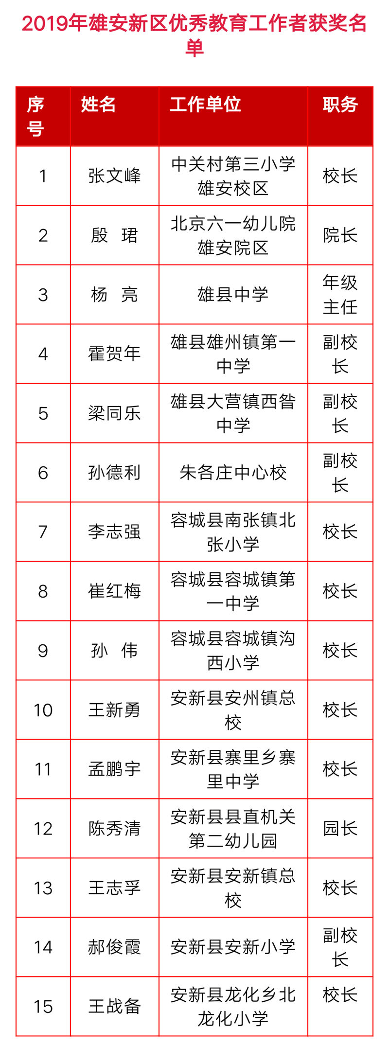 從9月10日召開的雄安新區教師節座談會上獲悉,為表揚先進,弘揚新時代尊師風尚,雄安新區授予楊永輝等30名同志“雄安新區優秀教師”榮譽稱號,授予張文峰等15名同志“雄安新區優秀教育工作者”榮譽稱號,授予雄縣中學等3所學校“高中段教育教學管理先進學校”榮譽稱號,并對以上獲獎同志和學校予以通報表揚。