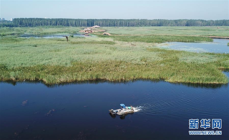 這是一艘打撈船在白洋淀景區(qū)內清理漂浮物(8月31日無人機拍攝)。新華社記者 牟宇 攝