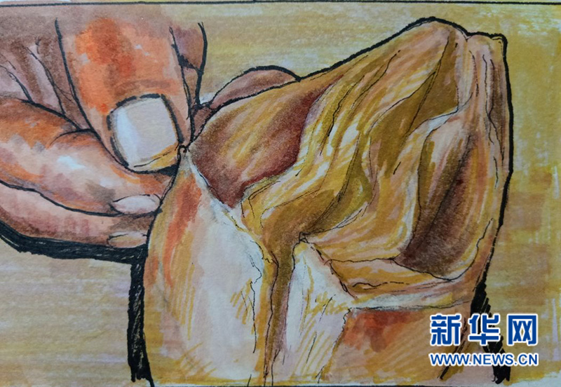 在端村,有一個(gè)名叫王老強(qiáng)的四方火燒傳承人。人們都說他的火燒好吃,還正宗。這正宗在哪兒呢?一是,揉面功夫好。王老強(qiáng)從十三歲開始練武,他總喜歡把這身功夫用在和面上,用他的話說是干活就講究個(gè)精氣神兒,拿著武架子干活兒不累,精神十足。這和面有勁兒、速度快,再加上練武能強(qiáng)身健體,他胳膊有力量,和出面來勁道,比機(jī)器加工的好吃。二是,王老強(qiáng)在和面的時(shí)候,往面里抹了油酥、芝麻鹽,再用搟面杖一遍一遍搟成方形的,根本不用模子。