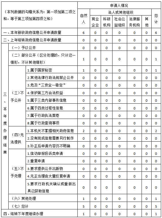 本報告依據《中華人民共和國政府信息公開條例》(以下簡稱《條例》)規(guī)定編制,全文包括總體情況、主動公開政府信息情況、收到和處理政府信息公開申請情況、政府信息公開行政復議及行政訴訟情況、存在的主要問題及改進情況等內容。報告所列數據統(tǒng)計期限為2019年1月1日至2019年12月31日。