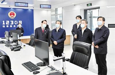 中共中央政治局委員、中央政法委書記、中央依法治國辦主任郭聲琨28日至29日在河北調研。這是郭聲琨到雄安新區政法單位聽取智能化建設運用等情況介紹。河北日報記者趙威 攝