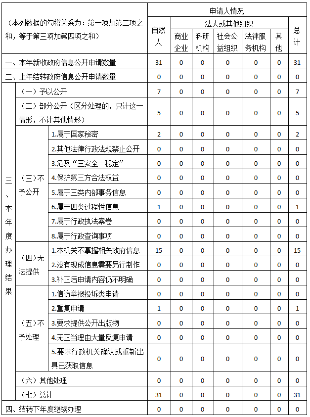 (二)依法辦理依申請公開。編制《河北雄安新區管理委員會政府信息公開指南》并公布,為公民、法人和其他組織規范申請管委會政府信息公開提供指引。認真學習貫徹《河北省政府信息公開申請辦理規范》,優化完善《新區管委會政府信息公開申請處理流程圖》,規范登記、審核、辦理、答復、歸檔各環節工作。全年接收政府信息公開申請31件,全部依法按時辦結。辦理因信息公開引起的行政復議1起,尚未審結。
