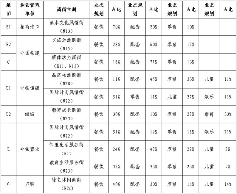 5條普通商街以滿足居民日常生活的基礎業態為主,打造社區親和型商街,E11商街推薦業態主題為“健康生活”;N15商街推薦業態主題為“文化休閑”;N20商街推薦業態主題為“品質生活”;N23商街推薦業態主題為“親子教育”;N26商街推薦業態主題為“綠色生活”。