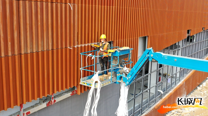 5月12日,工人們在進行外立面安裝施工。長城網記者霍少軒 攝
