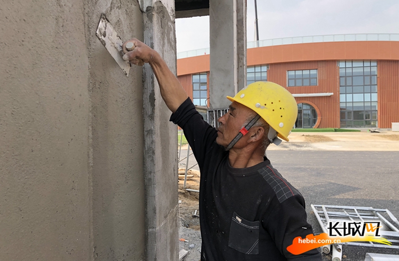 5月12日,工人們對外墻進行抹水泥作業。長城網記者霍少軒 攝