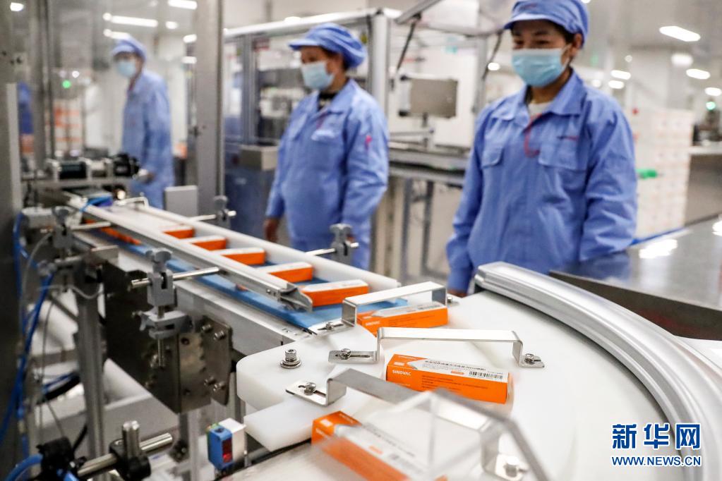 1月6日,科興中維的工作人員在檢查新冠病毒滅活疫苗全自動包裝線運行情況。新華社記者盧燁 攝