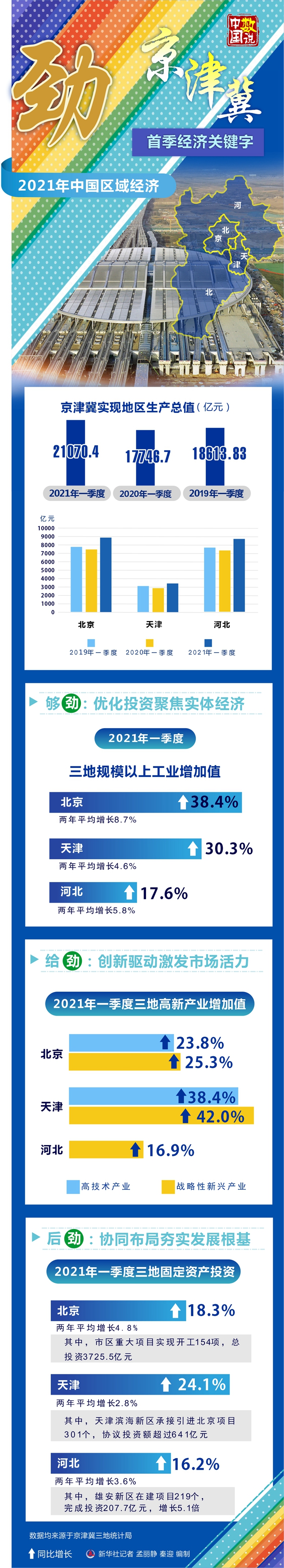 今年一季度,北京、天津、河北地區生產總值同比分別增長17.1%、15.9%、15.1%,實現穩健開局,三地攜手在優化投資、激活市場、協同布局方面施策施力,推動京津冀協同發展戰略向縱深推進,夯實經濟可持續發展后勁。