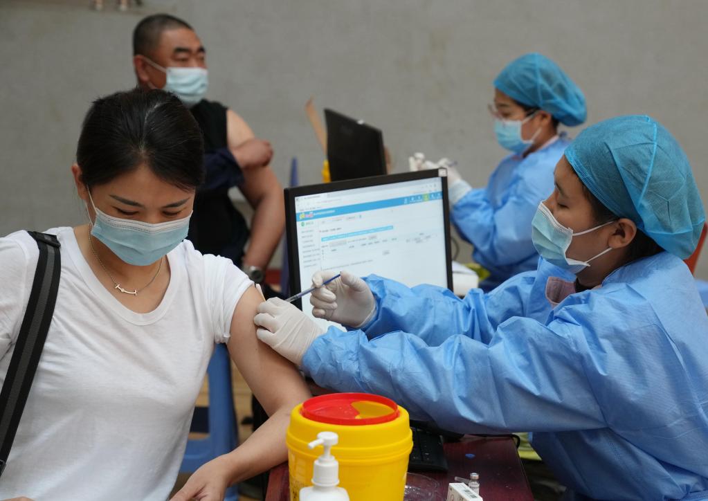 5月28日,在唐山市海港經濟開發區體育館新冠疫苗接種點,醫務人員在給市民接種新冠疫苗。新華社記者楊世堯 攝
