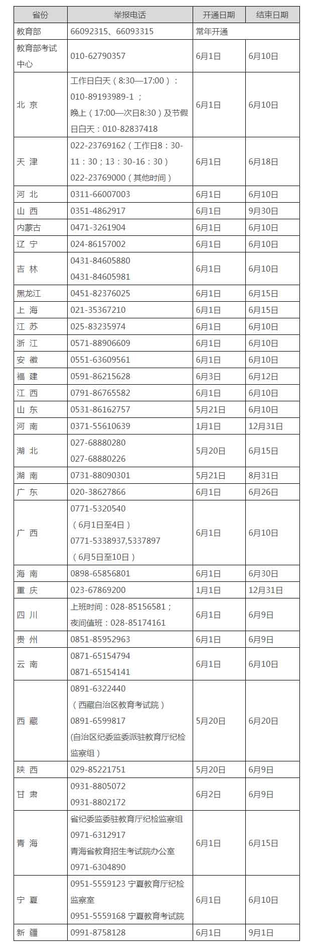 近日,教育部統一公布了教育部以及全國31個省(區、市)教育行政部門和招生考試機構2021年的高考舉報電話,歡迎廣大考生、家長及社會各界人士及時舉報反映涉及2021年高考的問題線索。教育部及各省(區、市)將會同有關部門根據舉報線索第一時間核查處理,堅決維護高考公平公正。
