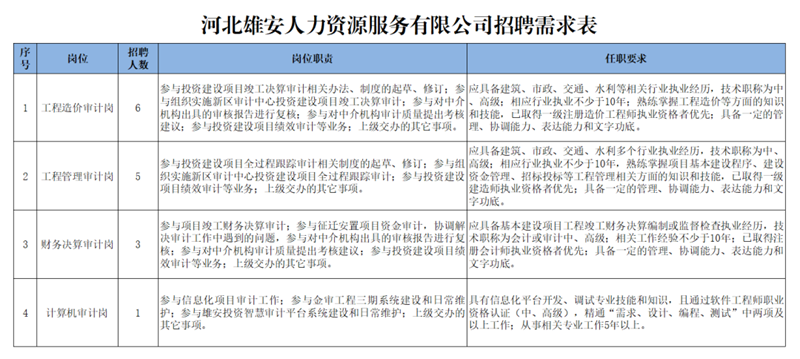 河北雄安人力資源服務有限公司根據工作需要,現面向社會公開招聘投資審計專業人員,工作地點在雄安新區。有關事項公告如下。