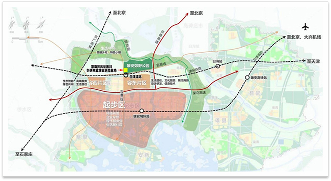 項目東臨雄安郊野公園,西臨北城村,南鄰容易線,與高鐵白洋淀站毗鄰。