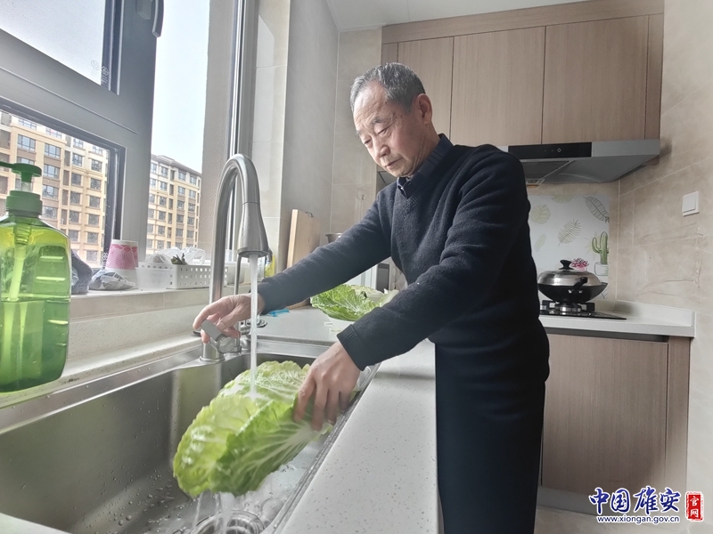 王所印在新房廚房里洗菜準備晚餐。中國雄安官網黃海 攝