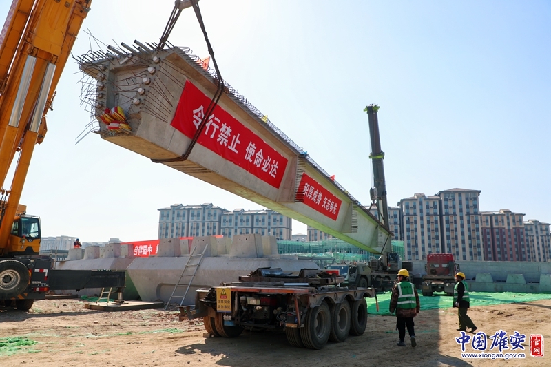 項目施工現(xiàn)場,第一根預(yù)制箱梁正準(zhǔn)備安裝。中國雄安官網(wǎng)高盟 攝