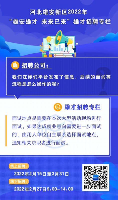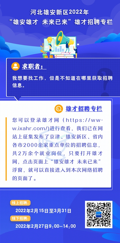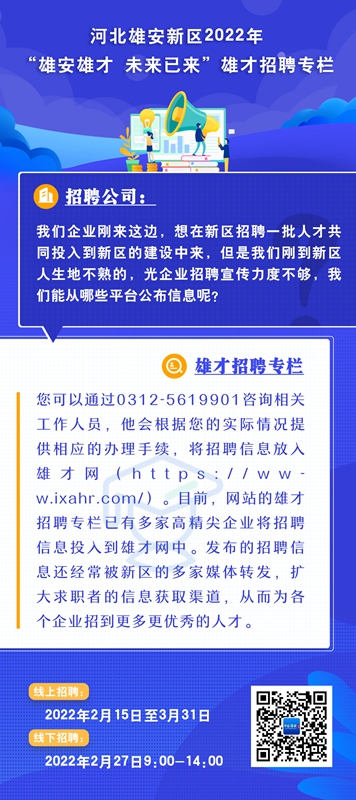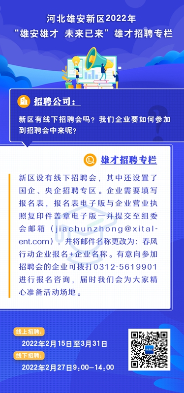 河北雄安新區(qū)2022年“春風(fēng)行動(dòng)”大型人力資源招聘會(huì)正在火熱進(jìn)行中。為更好服務(wù)市場(chǎng)主體,搭建招才引智平臺(tái),雄安新區(qū)黨群工作部設(shè)置“雄安雄才 未來(lái)已來(lái)”雄才招聘專欄。如果你有廣攬英才的意向,在這里,總有讓你心動(dòng)的人才;如果你有建設(shè)雄安的意向,在這里,總有讓你心動(dòng)的職位!