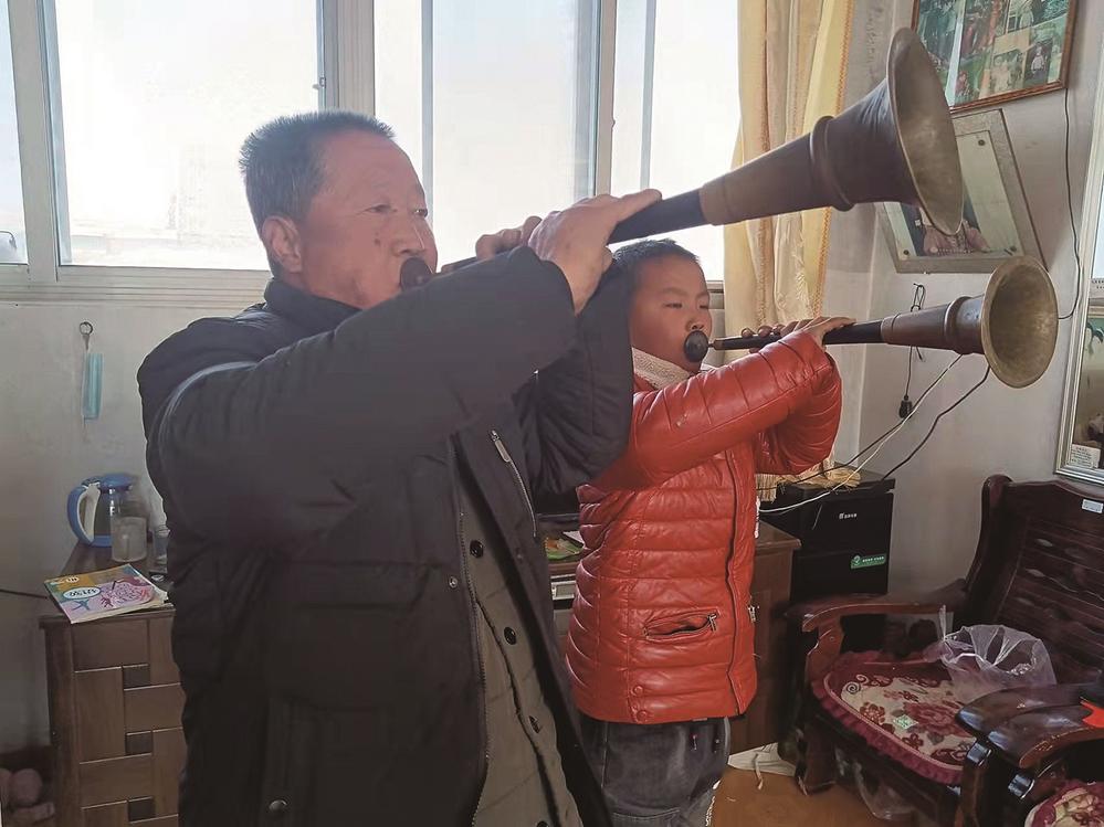 孩子在跟柴玉江學吹嗩吶。張莉 攝