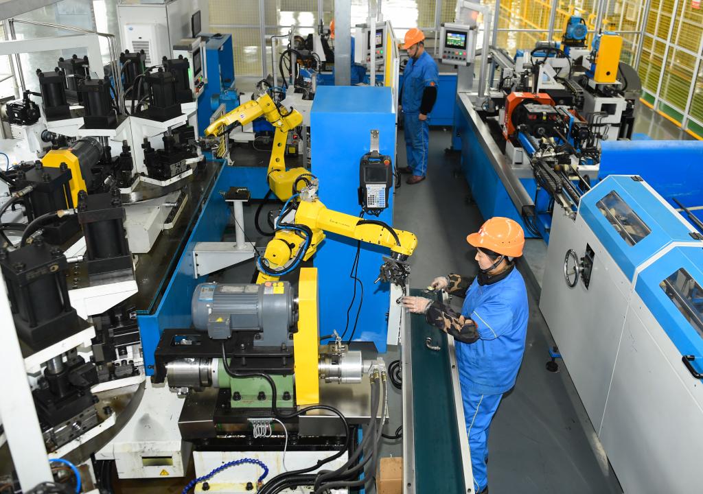 2月14日,在位于浙江省湖州市吳興區的金洲管道科技股份有限公司,工作人員和智能機器人協作生產不銹鋼管件。新華社記者翁忻旸 攝