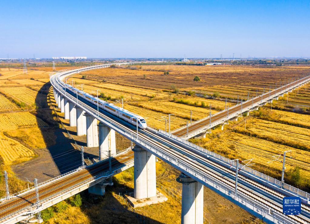 這是在天津北辰區(qū)拍攝的動車組列車行駛在京濱城際鐵路寶坻至北辰段(2022年11月4日攝,無人機(jī)照片)。新華社發(fā)(李佳駿 攝)
