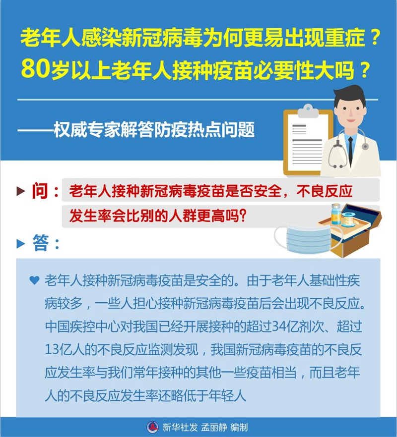 答:老年人接種新冠病毒疫苗是安全的。由于老年人基礎性疾病較多,一些人擔心接種新冠病毒疫苗后會出現不良反應。中國疾控中心對我國已經開展接種的超過34億劑次、超過13億人的不良反應監測發現,我國新冠病毒疫苗的不良反應發生率與我們常年接種的其他一些疫苗相當,而且老年人的不良反應發生率還略低于年輕人。