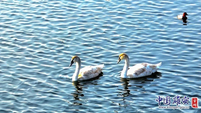 看,全身羽毛潔白、脖頸細長,前額有一塊瘤疣的突起,這是在我國總數(shù)不超過3000只的珍稀鳥類疣鼻天鵝,它們在白洋淀水面上覓食游動的影像,前不久被記錄了下來。