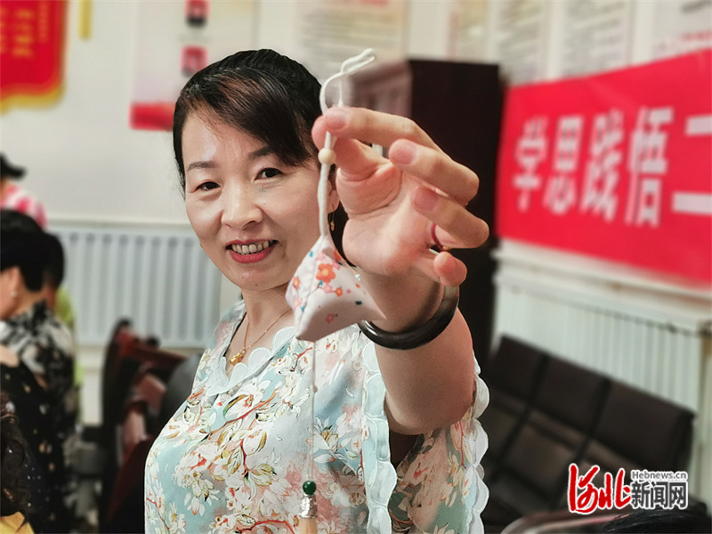 活動(dòng)現(xiàn)場(chǎng),宣講員和志愿者一起動(dòng)手包粽子和制作香囊。隨后,宣講員走進(jìn)上坡村新建的文化廣場(chǎng)上,將粽子和香囊送給涼亭內(nèi)休息的群眾。