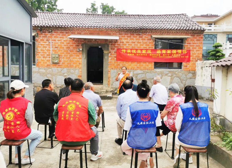安徽省銅陵市義安區西聯鎮新時代文明實踐所開展“傳承優良家風 涵育家國情懷”端午節文明實踐活動。“中國好人”汪世本在自家農家小院改造成的“鄉野文化棚”外向村民講訴優良家風故事,并和志愿者一起開展創作詩詞等主題志愿服務活動,共同探尋端午文化魅力,激發大家的愛國情懷。