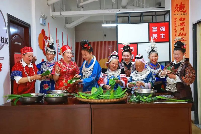 貴州省黔東南州凱里市白果井街道思源社區移民搬遷群眾和志愿者來到新時代文明實踐站,現場通過包粽子、話端午,共度佳節,營造了濃厚的節日氛圍。