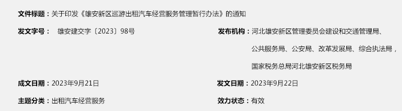 《雄安新區巡游出租汽車經營服務管理暫行辦法》已于2023年7月22日經新區黨工委第28次委員會審議通過,現由河北雄安新區管理委員會建設和交通管理局會同雄安新區公共服務局、公安局、改革發展局、綜合執法局、稅務局聯合印發,請認真抓好貫徹落實。