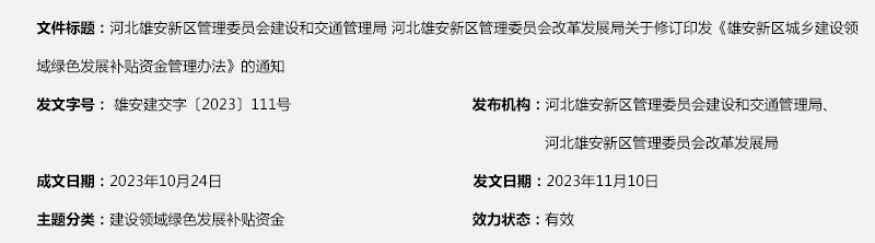 為促進雄安新區城鄉建設領域綠色發展,加強和規范城鄉建設領域綠色發展補貼資金管理,提高財政資金使用效益,我們對《雄安新區城鄉建設領域綠色發展專項資金管理辦法(試行)》(雄安規建字〔2022〕93號)進行了修訂,名稱修改為《雄安新區城鄉建設領域綠色發展補貼資金管理辦法》。現將修訂后的管理辦法印發給你們,請遵照執行。此前印發的辦法同時廢止。