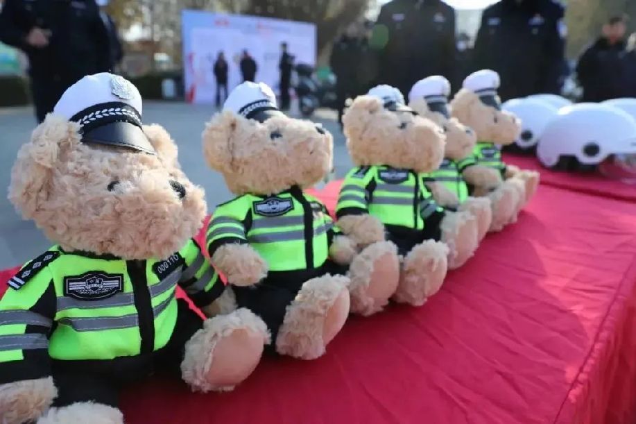 現場為學生代表佩戴安全頭盔,贈送交警小熊。