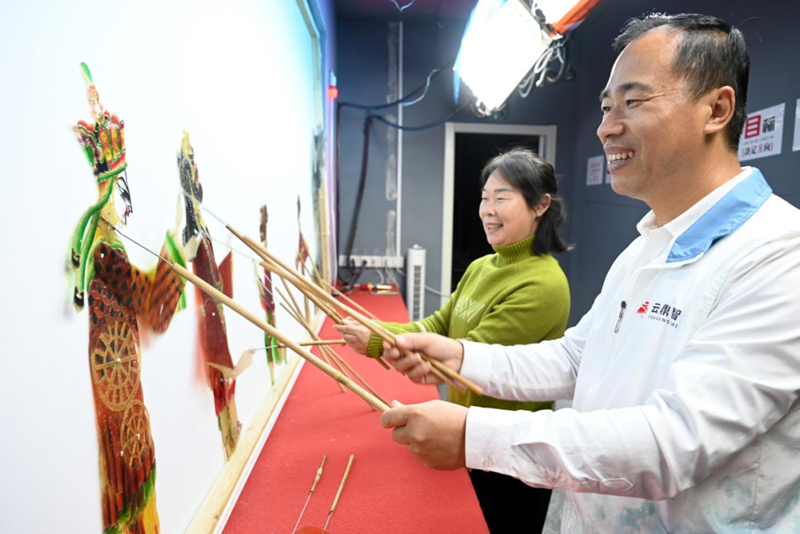 雄安郊野公園古韻非遺展館講解員李志軍和游客一起體驗皮影戲。劉光昱 攝
