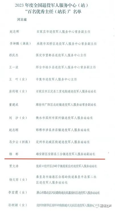 近日,退役軍人事務部辦公廳發布2023年度全國退役軍人服務中心(站)“百名優秀主任(站長)”名單,對全國100名基層退役軍人服務中心(站)主任(站長)給予通報表揚,安新縣三臺鎮退役軍人服務站副站長楊彬榮登榜單,為雄安新區唯一獲此榮譽人員。