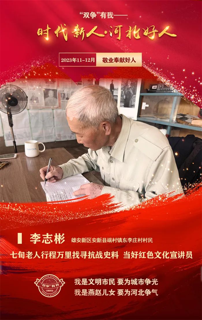 李志彬,男,1951年8月出生,雄安新區安新縣端村鎮東李莊村村民。多年來他奔走新疆、福建、遼寧、北京等地,行程上萬公里,收集抗戰史料書籍、刊物、報紙、雜志,走訪史料相關證人;成立“雄安水淀紅色文化書屋”收藏黨史資料和相關書籍,警醒廣大群眾勿忘歷史,銘記黨恩;潛心學習黨史知識,當好愛國主義教育志愿“宣傳員”,舉辦圖片史料展,將抗戰故事改編成話劇讓學生們排演,激發他們的愛國主義情懷。