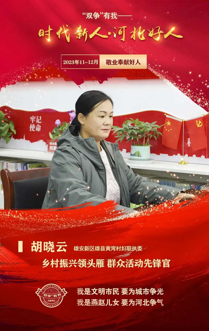 胡曉云,女,1978年9月生,中共黨員,雄安新區雄縣黃灣村婦聯執委。胡曉云忠于職守,無私奉獻,自覺扛起責任擔當大旗,做巾幗不讓須眉表率。在維護社會治安中,她牽頭成立女民兵巡邏隊,在節假日堅持晝夜巡邏;在人居環境整治工作中,她帶頭積極清理街道衛生,創建美麗庭院,深入農戶家中進行幫教打掃;在“雄山文化主題公園”建設中,她帶領女子民兵連義務植樹、種花,在保證工程質量的前提下,縮短了工期,為村內節省了成本。榮獲“雄縣最美家庭”“雄縣新型農業示范帶頭人”等榮譽稱號。