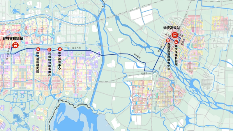 線路中途設站5處,分別為中交未來科創城、自貿區管理服務中心、雄安體育中心、科創綜合服務中心、雄安創新研究院。