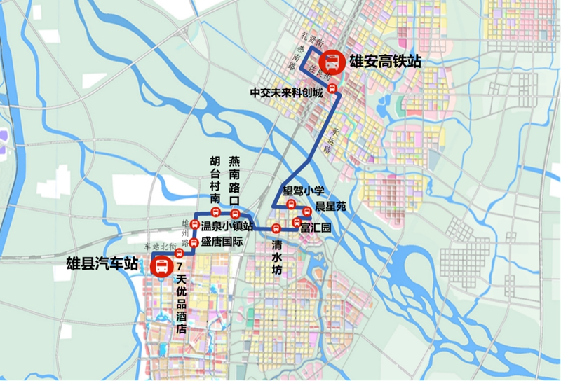 線路全程由雄安站出發,經禮賢街、燕南路、佐良街、承運路、望駕街、海岳東大街、愛景街、同德三路、燕趙東大街、啟雄路、雄州路、車站北街、車站西路、車站南街到達終點雄縣汽車站。