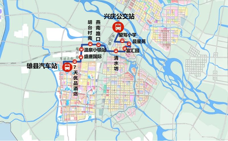 區間線路由雄縣汽車站出發,經車站南街、車站西路、車站北街、雄州路、啟雄路、燕趙東大街、同德三路、愛景街、海岳東大街、望駕街、承運路到達終點興慶公交站。