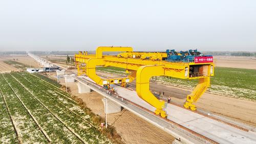 近日,中鐵十一局建設者在雄安新區至商丘高速鐵路(以下簡稱雄商高鐵)河北段棗清特大橋項目現場進行架梁施工。