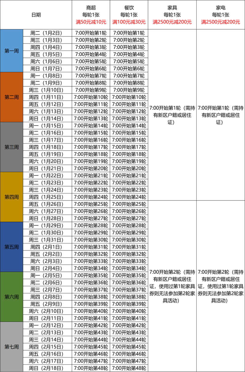 面額為滿2500元減200元,共開(kāi)展2輪。第一輪搶券和用券時(shí)間為1月2日7:00至1月25日23:59,第二輪搶券和用券時(shí)間為1月26日7:00至2月18日23:59。每個(gè)符合條件的用戶可在2輪活動(dòng)中任選1輪參加,一旦在第1輪成功領(lǐng)取并使用了家具券,則不可在第2輪領(lǐng)取家具券,如未在第1輪領(lǐng)取或在第1輪領(lǐng)取但未使用任何一張家具券,則仍可在第2輪領(lǐng)取并使用家具券。