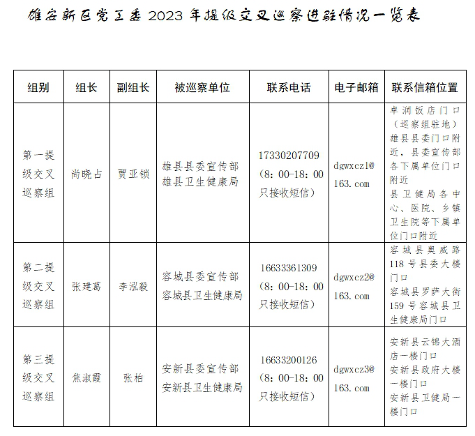 經新區黨工委批準,新區黨工委2023年提級交叉巡察,組建3個巡察組,對雄縣縣委宣傳部、衛生健康局,容城縣委宣傳部、衛生健康局,安新縣委宣傳部、衛生健康局6個單位開展提級交叉巡察。被巡察單位分別召開巡察工作進駐動員會,各縣委巡察工作領導小組領導出席會議并講話。