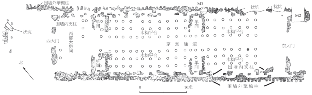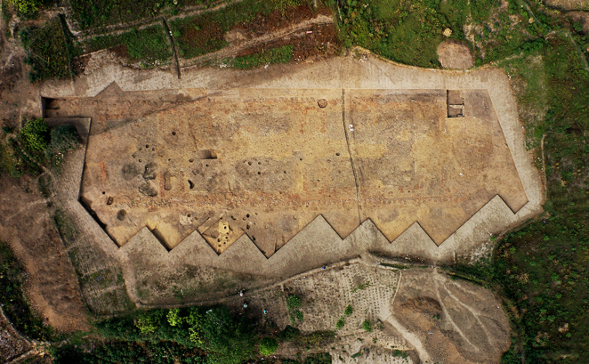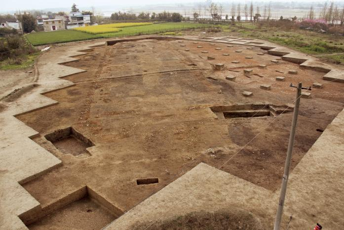在青關(guān)山一號大型建筑基址中,考古工作者還發(fā)現(xiàn)穿堂通道、東西大門、單間、木構(gòu)平臺等遺跡。學(xué)者推測,這可能是國內(nèi)迄今發(fā)現(xiàn)的年代最早、規(guī)模最大的干欄式樓閣建筑,其研究性復(fù)原仍須進(jìn)一步檢驗和論證。