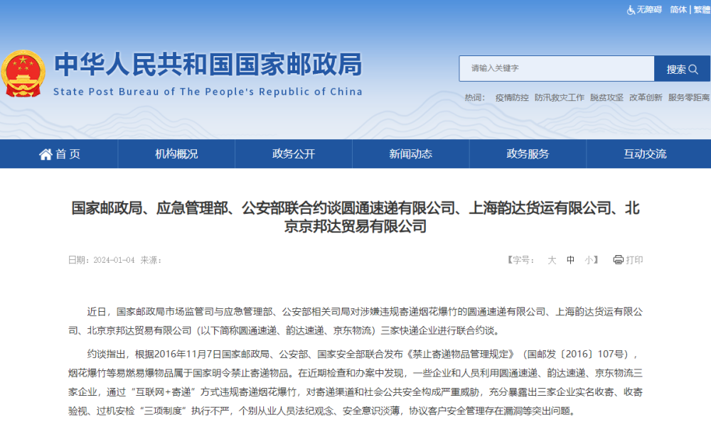 近日,國家郵政局市場監管司與應急管理部、公安部相關司局對涉嫌違規寄遞煙花爆竹的圓通速遞有限公司、上海韻達貨運有限公司、北京京邦達貿易有限公司(以下簡稱圓通速遞、韻達速遞、京東物流)三家快遞企業進行聯合約談。