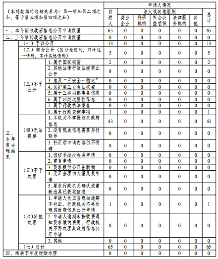 (二)依申請公開。細化完善依申請公開辦理流程,聚焦解決依申請公開堵點難點問題,加強信息分析研判,最大限度滿足申請人合理信息需求,切實提高依申請公開辦理工作時度效和群眾滿意度。全年共受理依申請公開65件,辦理因政府信息公開引起的行政復議、行政訴訟1件;妥善處置多起信息公開咨詢、投訴、舉報。