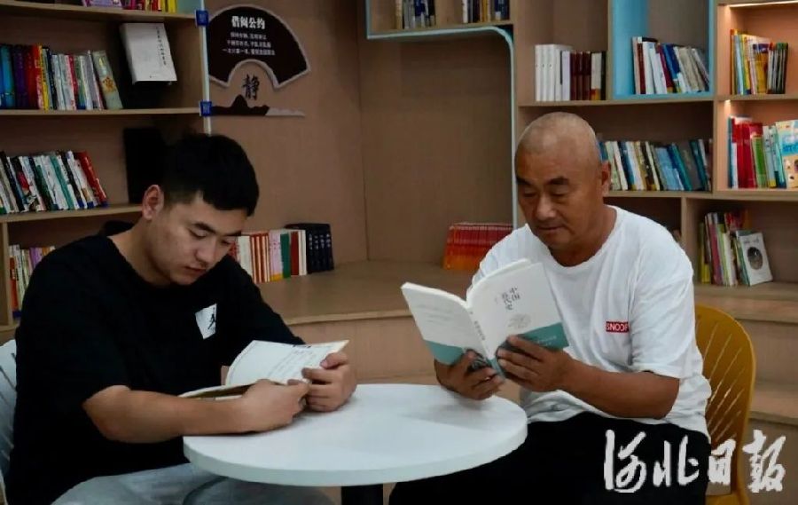 7月16日下午,雄安新區南文營社區居民劉炳輝(右)在社區黨群服務中心圖書角看書。河北日報通訊員王涵璞 攝