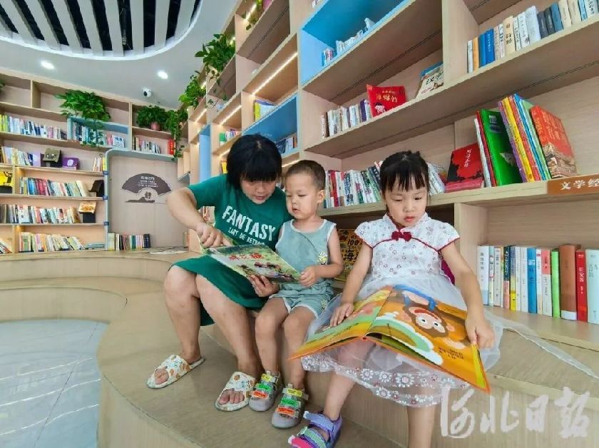 7月27日上午,南文營社區黨群服務中心里,一位媽媽帶著孩子在圖書角讀書。河北日報記者田明 攝