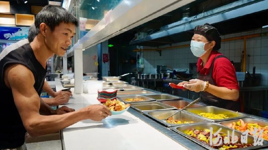 7月16日傍晚,雄安新區南文營社區食堂里,陸續有居民來打飯。河北日報通訊員王涵璞 攝