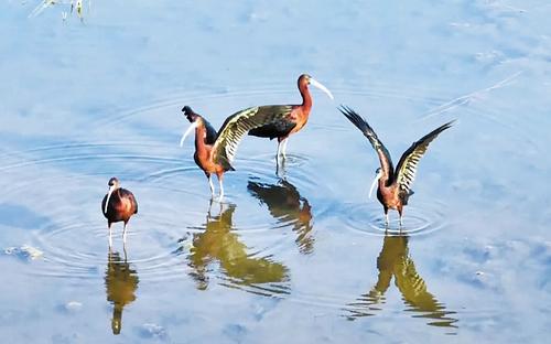 彩鹮是有著“東方寶石”之稱的朱鹮的近親,因為它的羽毛在太陽下會閃爍多彩金屬光澤,所以叫彩鹮?!吨袊鵀l危動物紅皮書》曾一度宣布彩鹮在我國絕跡。彩鹮在河北省雖有分布,但一次拍攝到6只“扎堆”出現,卻也十分罕見。