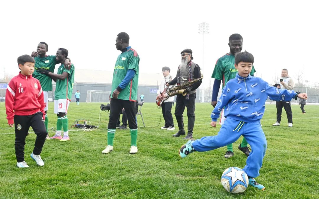 中場休息,場內場外的熱情不僅絲毫沒有“降溫”,反而更加火爆。隨著一支民間樂隊奏響歡快的樂曲,一群雄安“足球娃”興奮地跑進球場,與加納大朋友們展開球技“交流”。場邊,多名加納球員更是字正腔圓地唱起中文歌曲。